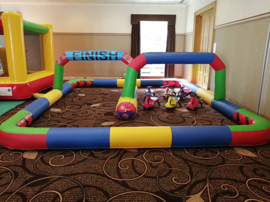- Bouncy Castle can go outside or indoors. The Didi Car track needs to go inside on a hard surface. Soft Play shapes need to go indoors.