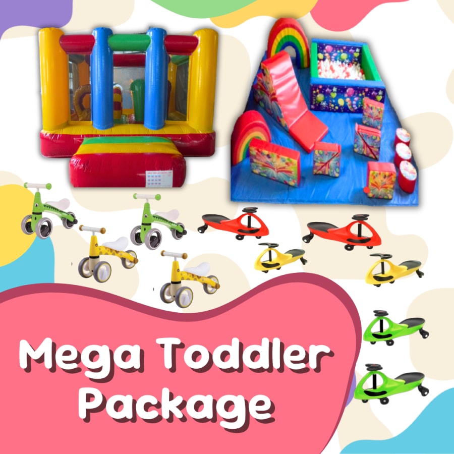 The 'Mega Toddler Package' is available in South Cumbria, North Lancashire, and the beautiful Lake District. It is tailored to captivate a large group of children below the age of 5. This package boasts a vibrantly colored rainbow castle, accompanied by a variety of soft play shapes, a fun ball pool, and an assortment of ride-on toys, ensuring the little ones have a myriad of entertainment options.