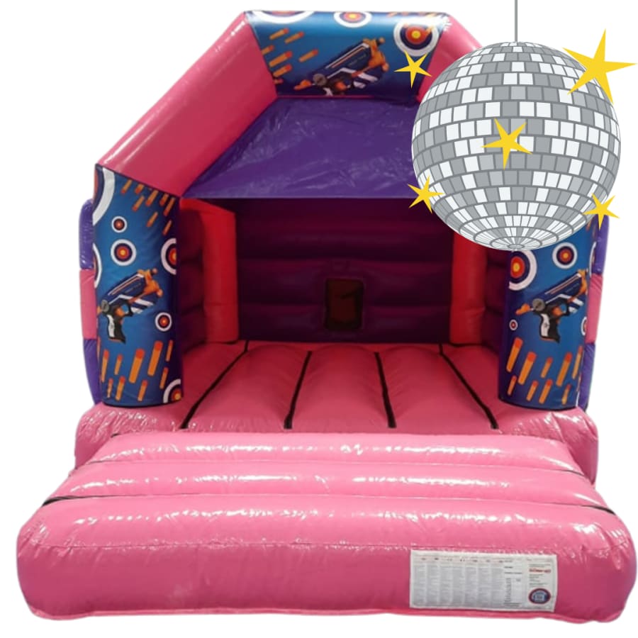 This Target/ Nerf themed castle is ideal for any fan of the army or Nerf. Featuring a good sized bouncing area, it will provide hours of entertainment. This castle features a Bluetooth speaker and disco light inside.