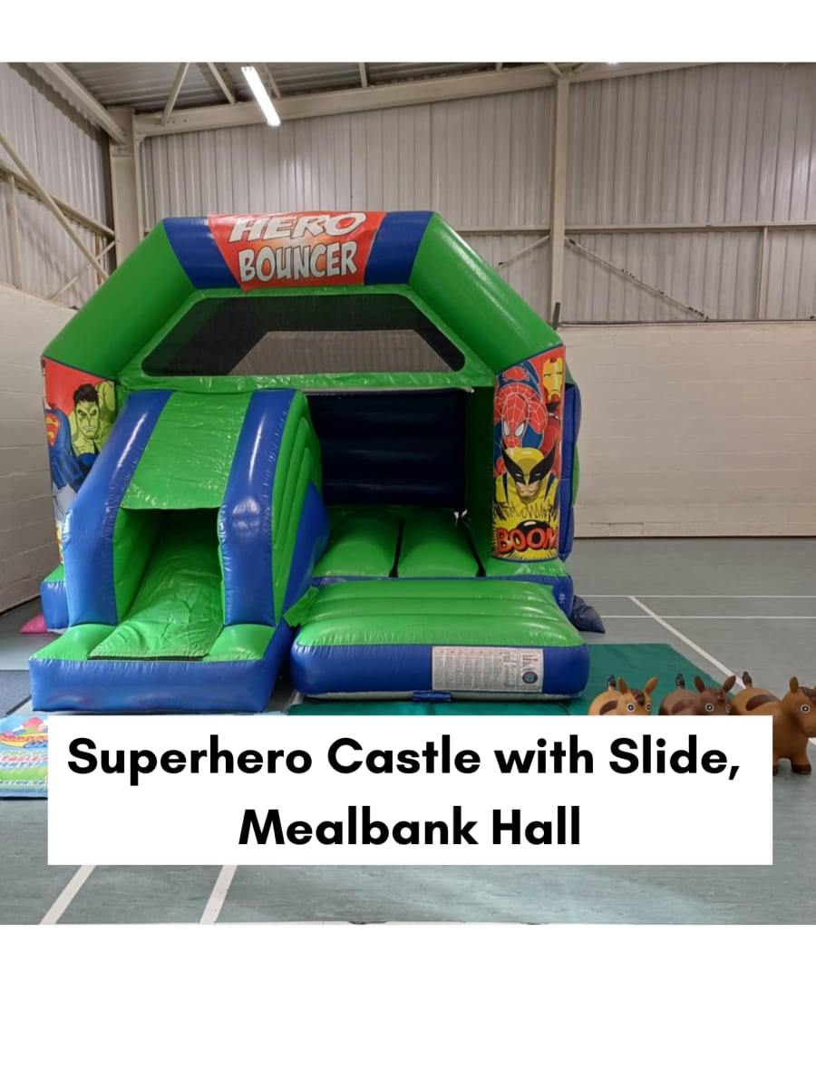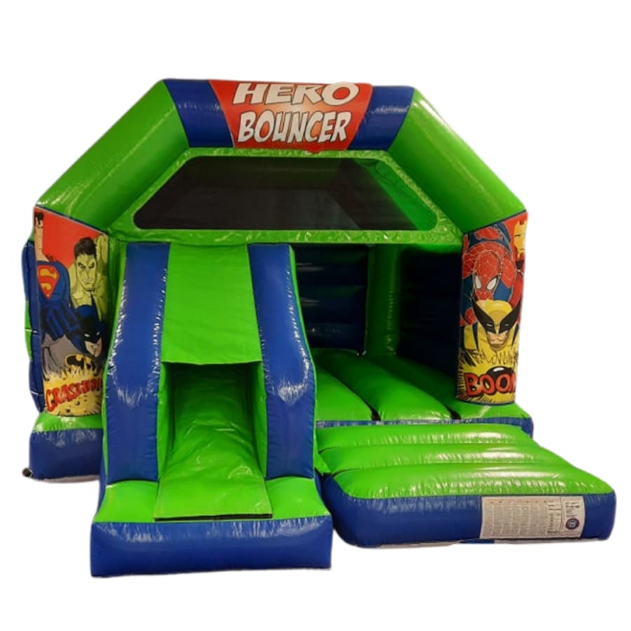 Book the Green and Blue Superhero Castle with Slide today and make your child’s superhero dreams come true!
