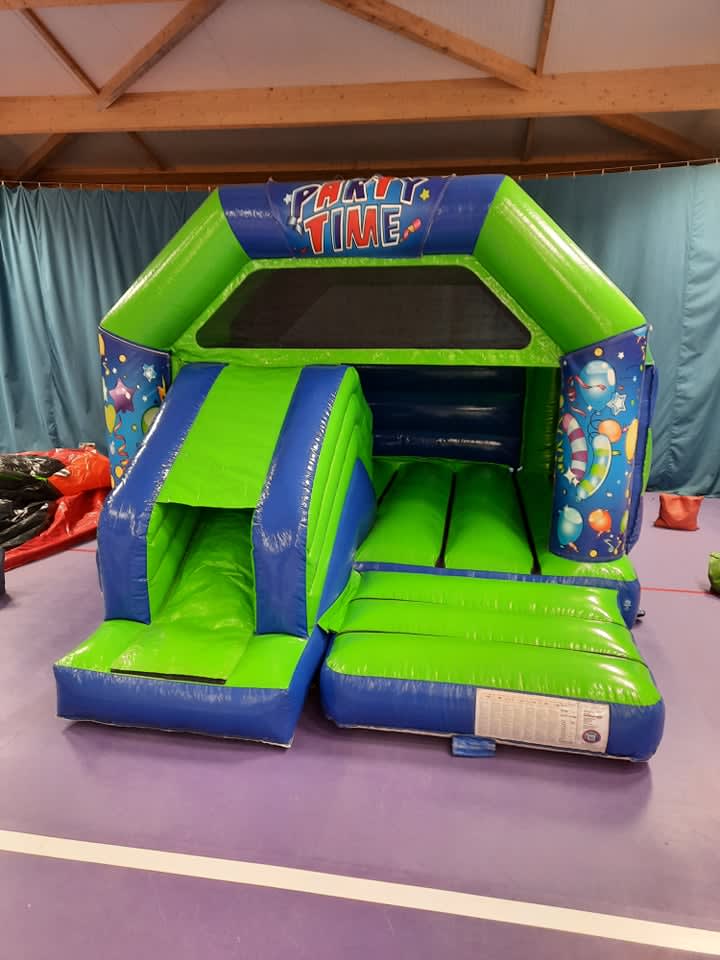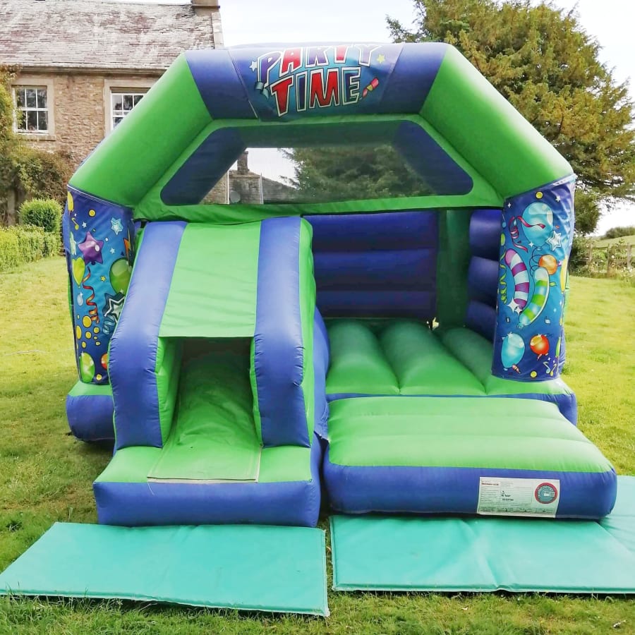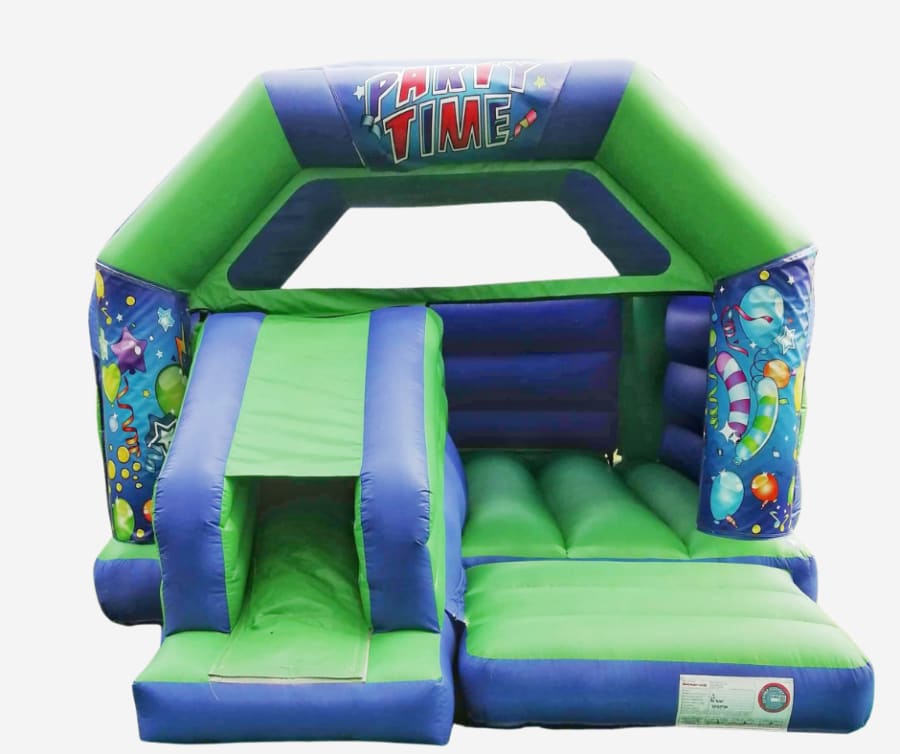 The Green and Blue Party Time Castle with Slide is the ultimate centerpiece for any celebration, combining a spacious bouncing area with an exciting slide for extra fun! Its vibrant Party Time theme, featuring festive balloons and streamers, makes it a fantastic choice for kids of all ages.