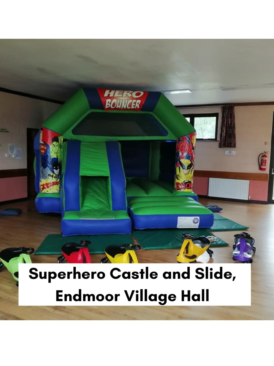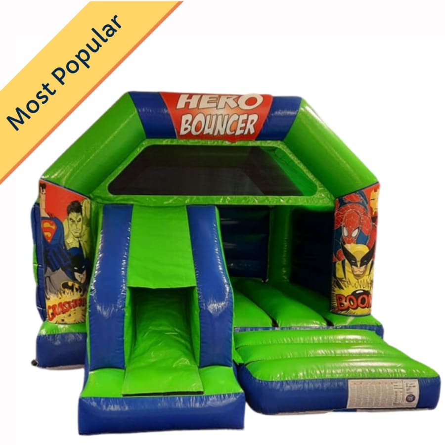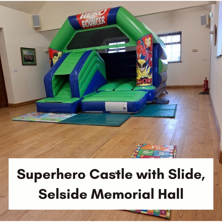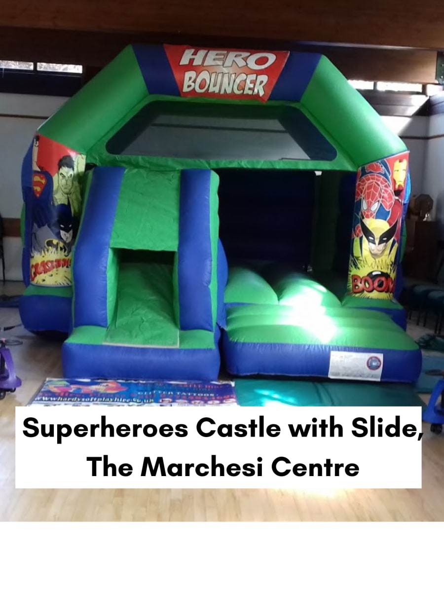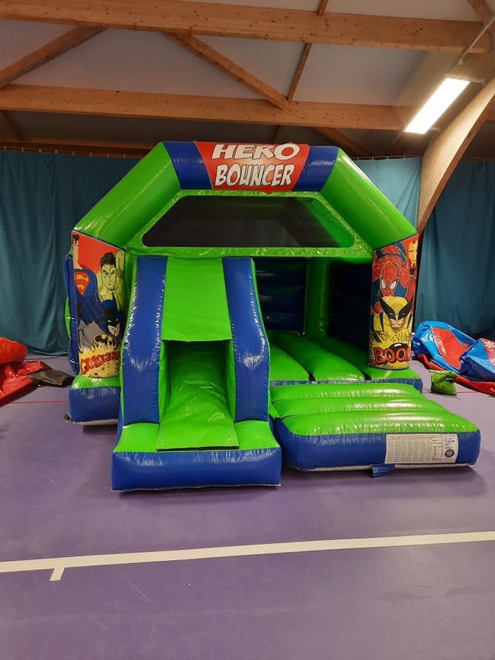 Book the Green and Blue Superhero Castle with Slide today and make your child’s superhero dreams come true!