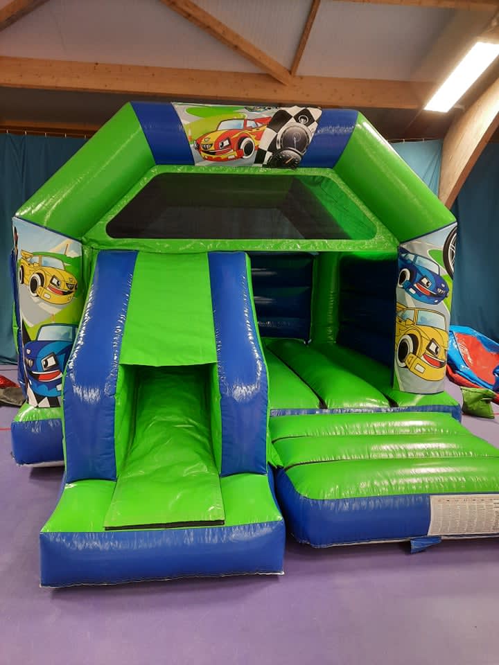 Rev up the excitement with the Green and Blue Racing Car Castle with Slide! Featuring bold red, yellow and blue racing cars, this inflatable is a dream for young motorsport fans. The addition of a slide at the front adds an extra element of fun, making this a perfect choice for kids who love speed and adventure. With a large bouncing area and thrilling slide, it promises hours of entertainment for boys and girls alike.
