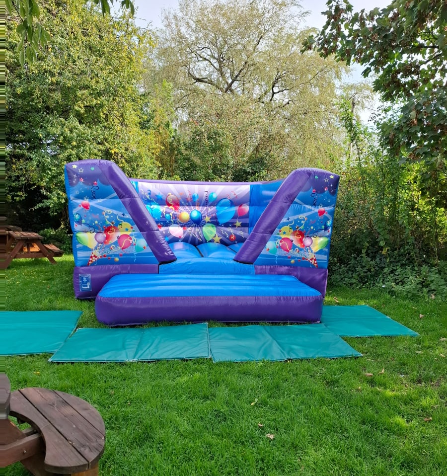 Add a pop of colour and fun to your event with our Purple Low Height Castle! Designed in a cheerful blue and purple party theme, this delightful bouncy castle is decorated with balloons and bright streamers, making it the perfect centrepiece for kids’ celebrations. Its open-roof, V-frame design ensures it’s ideal for venues with lower ceilings, so the fun can happen just about anywhere.