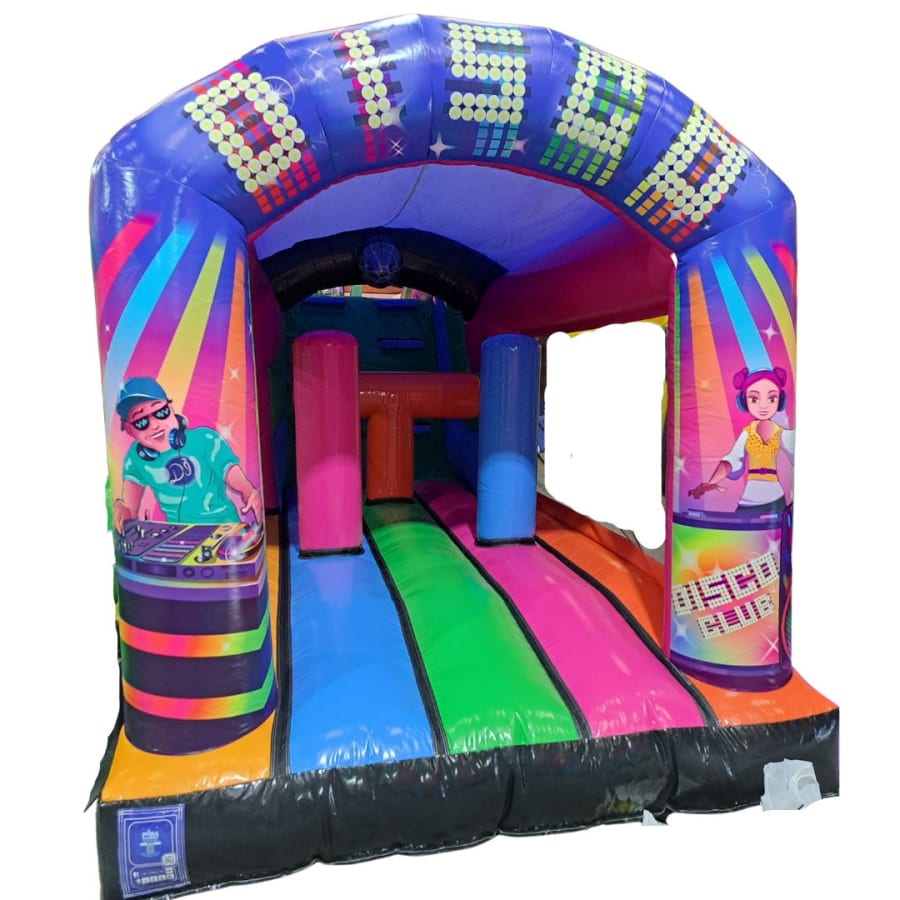 Get ready for a party like no other with the Inflatable Disco Obstacle Course! Combining the excitement of an obstacle challenge with the fun of a disco, this inflatable is designed to keep everyone entertained. Featuring vibrant disco-themed artwork, a built-in Bluetooth speaker to play music, and a dazzling disco light in the centre, it transforms any event into a lively dance floor. Kids and adults alike will love bouncing, climbing, and sliding their way through this unique attraction.