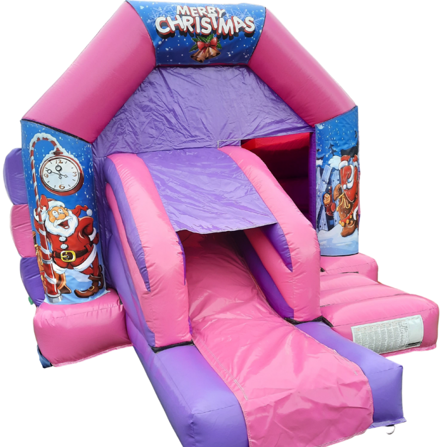 This pink Christmas themed bouncy castle features a bouncing area and a slide!