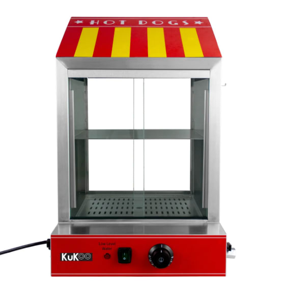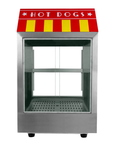 Dual Functionality: Equipped with two grated product trays for steaming delectable hot dogs and a solid shelf above for keeping buns warm, this machine ensures your hot dogs are served with perfection.