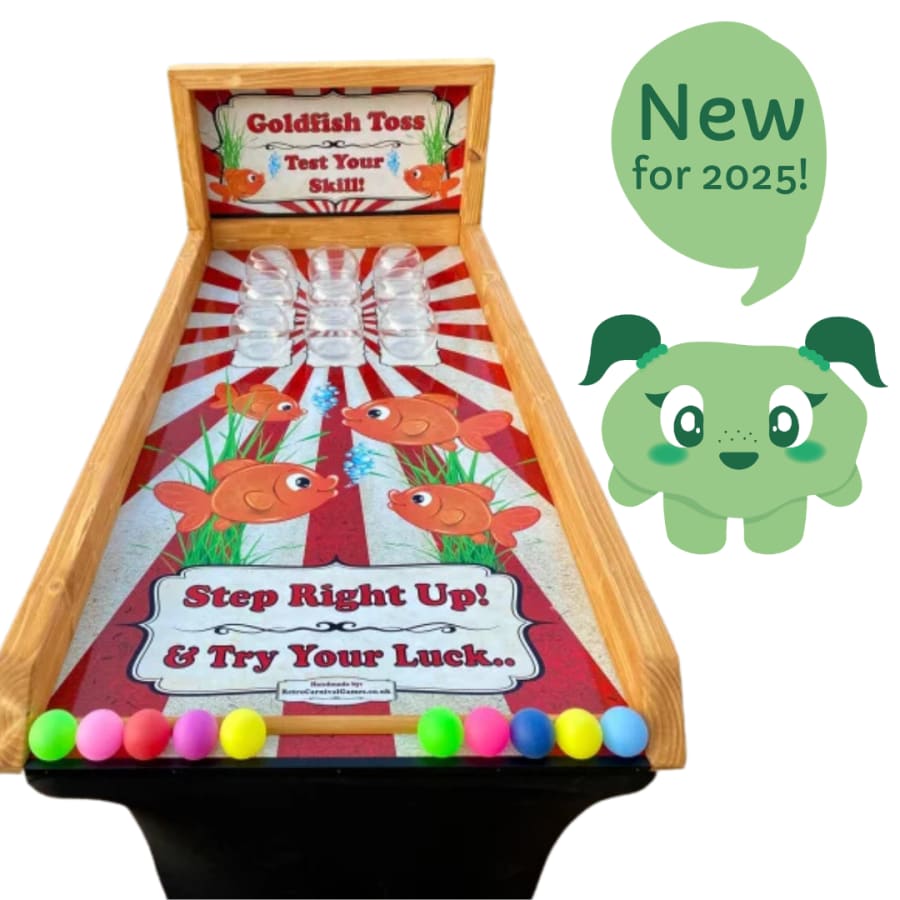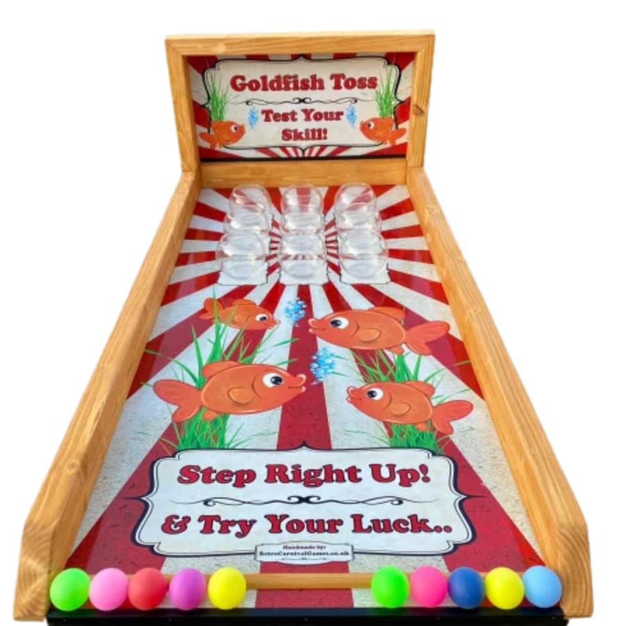 Test your skill and precision with Goldfish Toss, a traditional handmade wooden tabletop game that's harder than it looks! Bounce the coloured ping pong balls and aim to land them in the goldfish bowls—can you master the challenge? With its simple yet addictive gameplay, this timeless game brings excitement and friendly competition to any event.