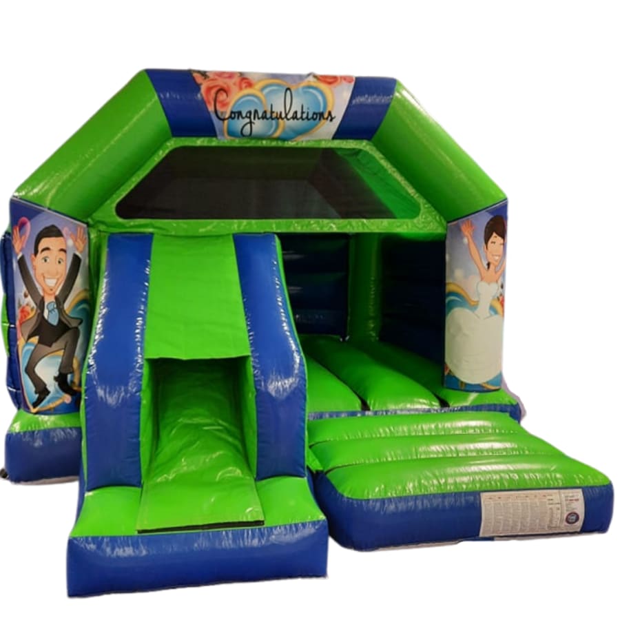 We have this fantastic wedding themed bouncy castle, which will really add the wow factor to your special day. This children’s bouncy castle is perfect to keep your younger guests entertained and give them a chance to play and enjoy the day. The bride and groom artwork will fit in with the celebrations and provide a great back drop for some of your photos. This bouncy castle features a slide at the front for even more fun!