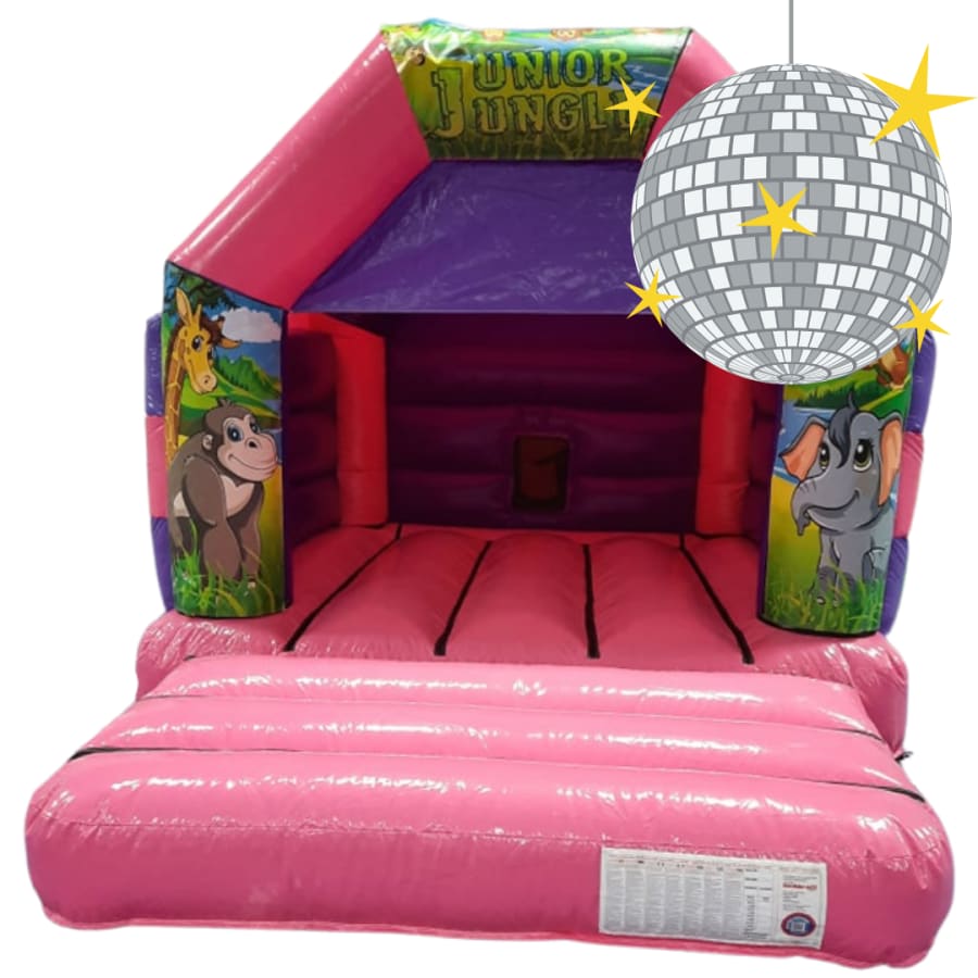 This Jungle themed Bouncy Caste features beautiful artwork for a jungle themed party or celebration. Featuring your child's favourite animals including a Giraffe, Gorilla, Elephant and a cheeky monkey. Featuring a good sized bouncing area, it will provide hours of entertainment. There is a Bluetooth speaker and disco light inside.