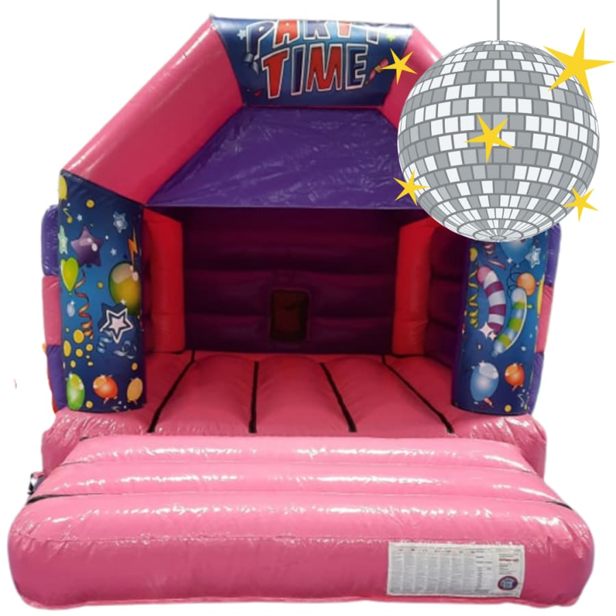This Party Time Themed Bouncy Caste features balloons and streamers around the entrance of the inflatable. Featuring a good sized bouncing area, it will provide hours of entertainment. There is a Bluetooth speaker and disco light inside.