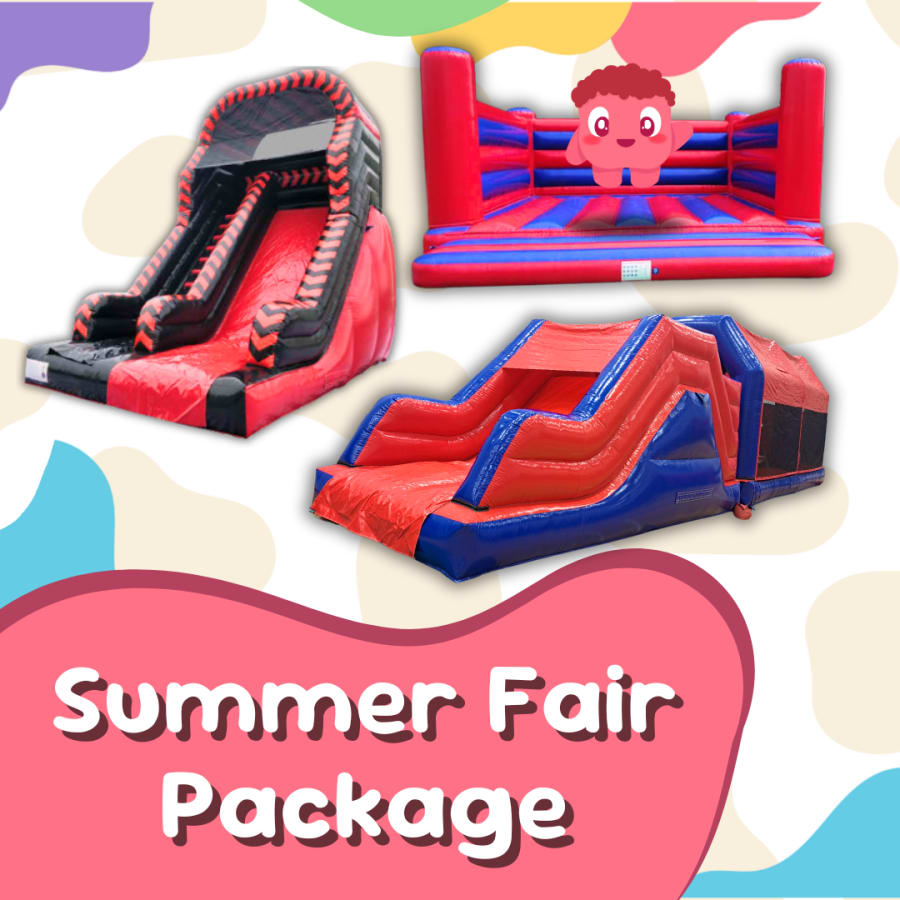 If you’re planning a large-scale event and need to cater for a wide age range, this 'Summer Fair Package' is for you. Not only does it include our standout Red and Blue Assault Course complete with biff bash pillars, built in bounce area and inflatable slide, but you also get our 19 foot platform slide, which will rise above all other attractions and guarantee queues of eager and excited children. Our Giant 24ft bouncy castle completes the collection, and a fantastic inflatable display to be enjoyed.