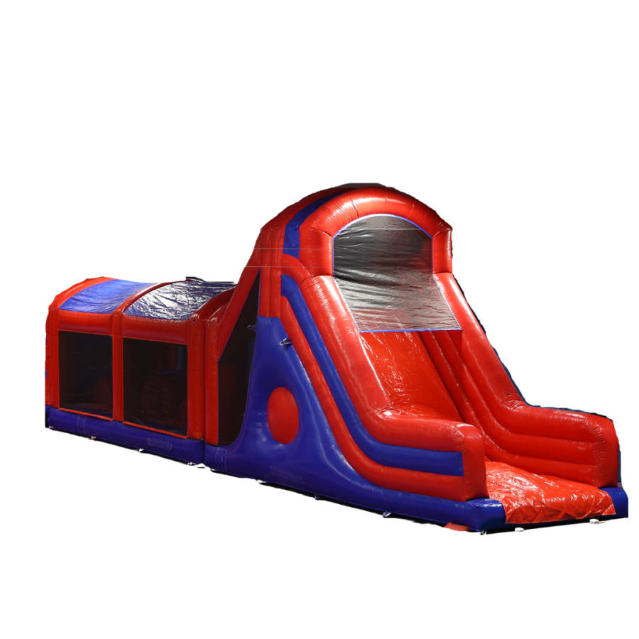 Massive two-part design featuring an obstacle course and an exhilarating 10ft slide. Engaging challenges include hurdles, biff and bash posts and a climbing wall. Suitable for adults and children, making it perfect for family events and group activities. Netted windows on the sides for easy supervision and enhanced safety.