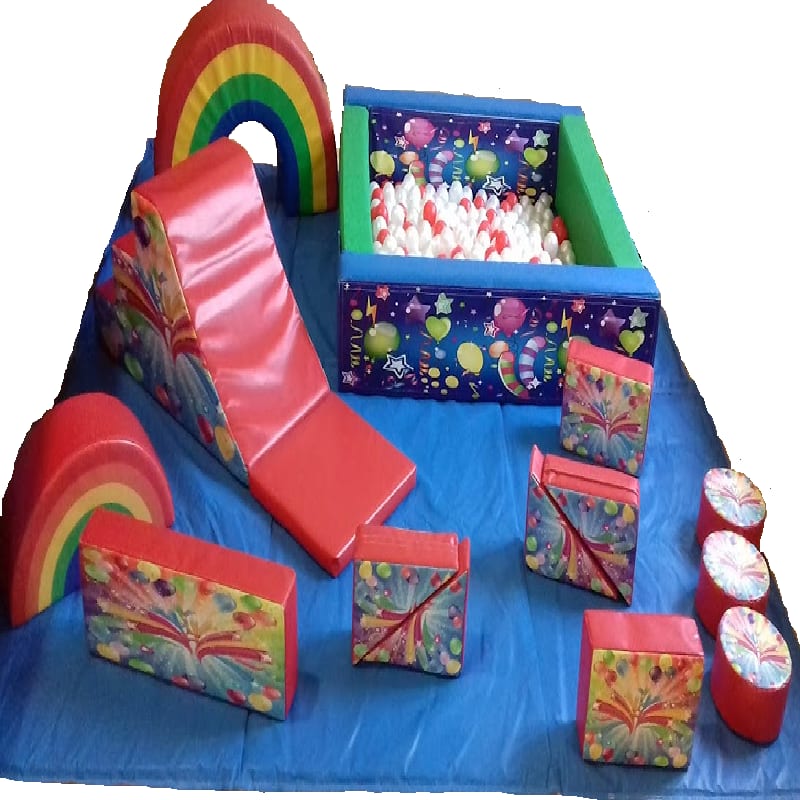 Firstly, it comes with our colourful ball pool. This is filled with balls for the children to dive into, and has steps and a slide for easy access for crawling babies, and older children. There is a soft base to prevent any bumps as they jump in. There are also 2 colourful rainbows, a large one to crawl under and over, and a smaller one which is great to handle and play with. 10 Soft play shapes come with this set which provide hours of fun developing their co-ordination building towers and dens. Our soft slide with matching artwork is very popular, and has a few steps to the top and a slide off area at the bottom. Very small children need supervising on the slide.