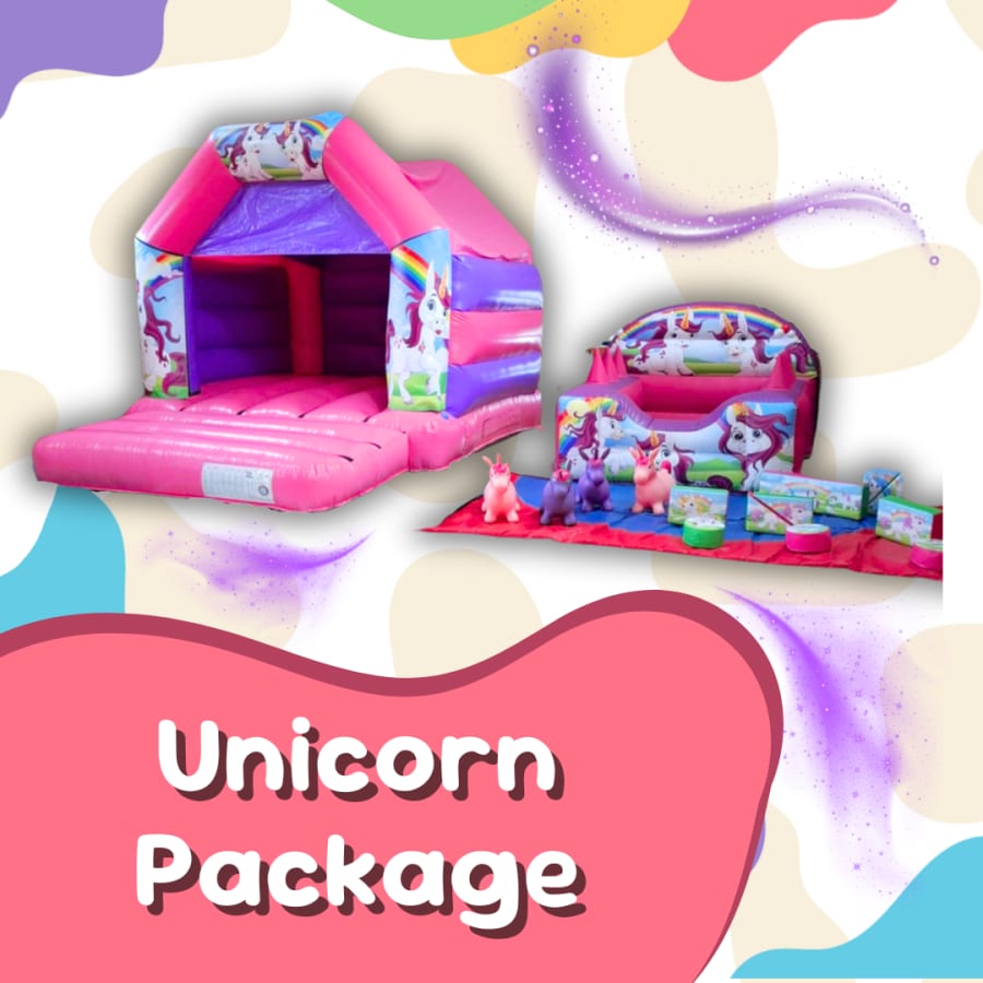 The 'Unicorn Package' is absolutely amazing. It has everything you need to give a unicorn enthusiast an amazing party including a Bouncy Castle, Ball Pool with Air Jugglers, Themed Soft Play Shapes and 4 Unicorn Hoppers.