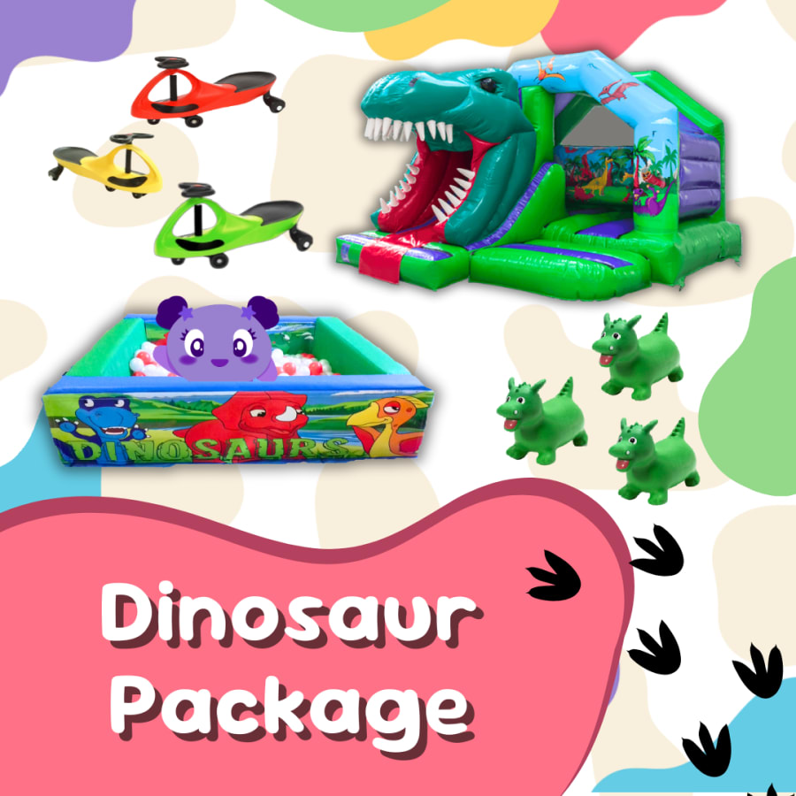 It features a 3D Dinosaur Bouncy Castle, equipped with a slide, and a delightful ball pool. Also included are 3 Didi cars and 3 Dino hoppers, ensuring the little adventurers have a roaring good time exploring the prehistoric wonders!
