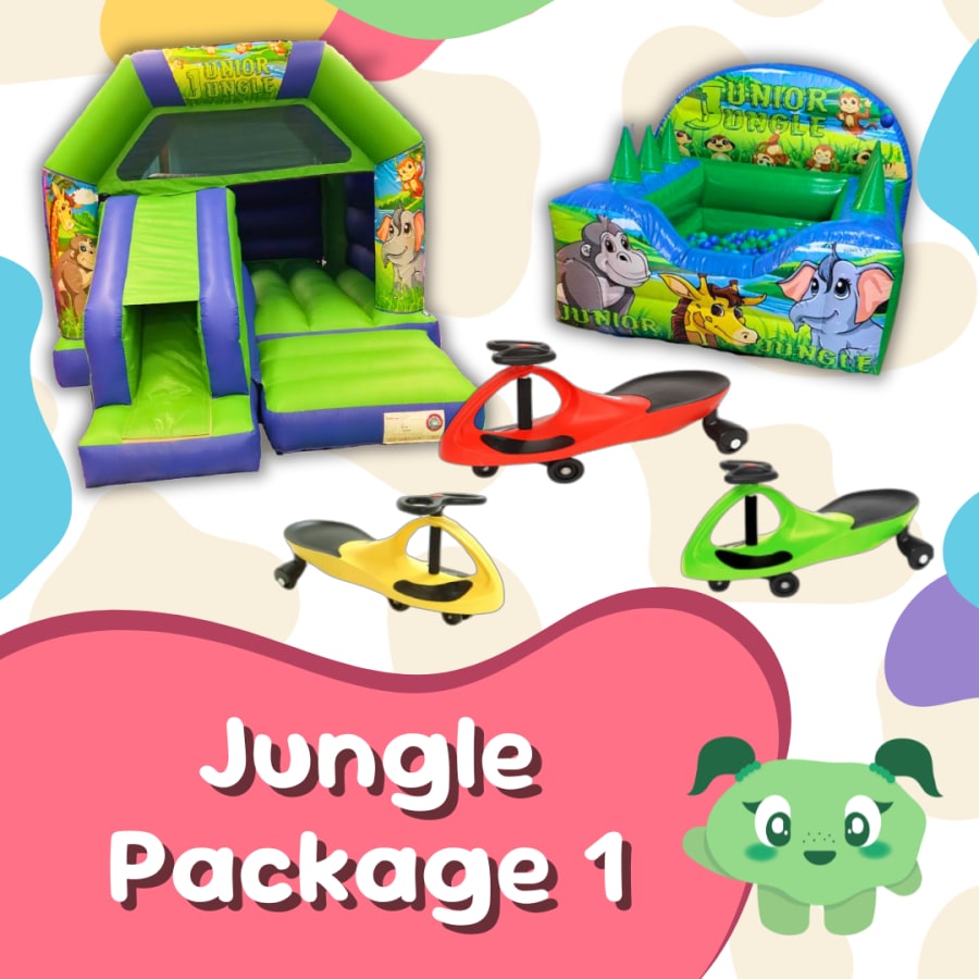 This 'Jungle Package' is perfect for young explorers of any gender. This package presents a bouncy castle complete with a slide in front of the bouncing section, making it a dual source of joy. Additionally, the ball pool is enhanced with six enchanting air jugglers that keep the balls magically suspended, providing an extra layer of excitement and wonder for the children. And...there are also 3 Didi Cars for your guests to race around on!