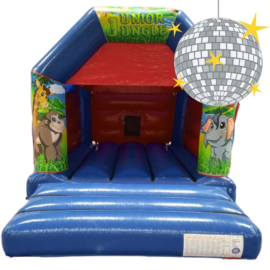 This Jungle themed Bouncy Caste features beautiful artwork for a jungle themed party or celebration. Displaying your child's favourite animals including a Giraffe, Gorilla, Elephant and a cheeky monkey. Featuring a good sized bouncing area, it will provide hours of entertainment. There is a Bluetooth speaker and a disco light in the castle.